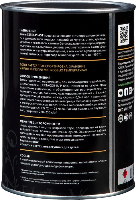 Формула CERTA на кремнийорганической основе защищает от коррозии, придает отличное сцепление с окрашиваемой поверхностью, возможность всесезонного нанесения в диапазоне −5...+35 °С. Высыхает на «отлип» за 30 минут при +20 °С.