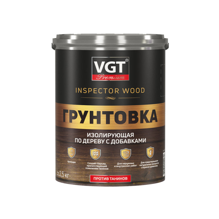 Изолирующий грунт по дереву VGT - это Грунтовка изолирующая по дереву с добавками против танинов. улучшает адгезию к последующим окрасочным слоям; создает барьер, препятствующий появлению танинов; для наружных и внутренних работ ; для предотвращения натуральных процессов старения.
