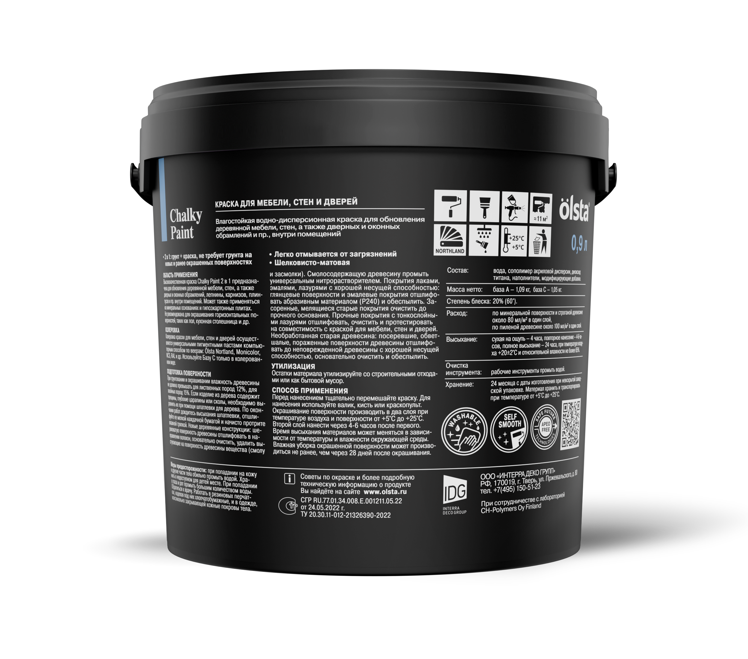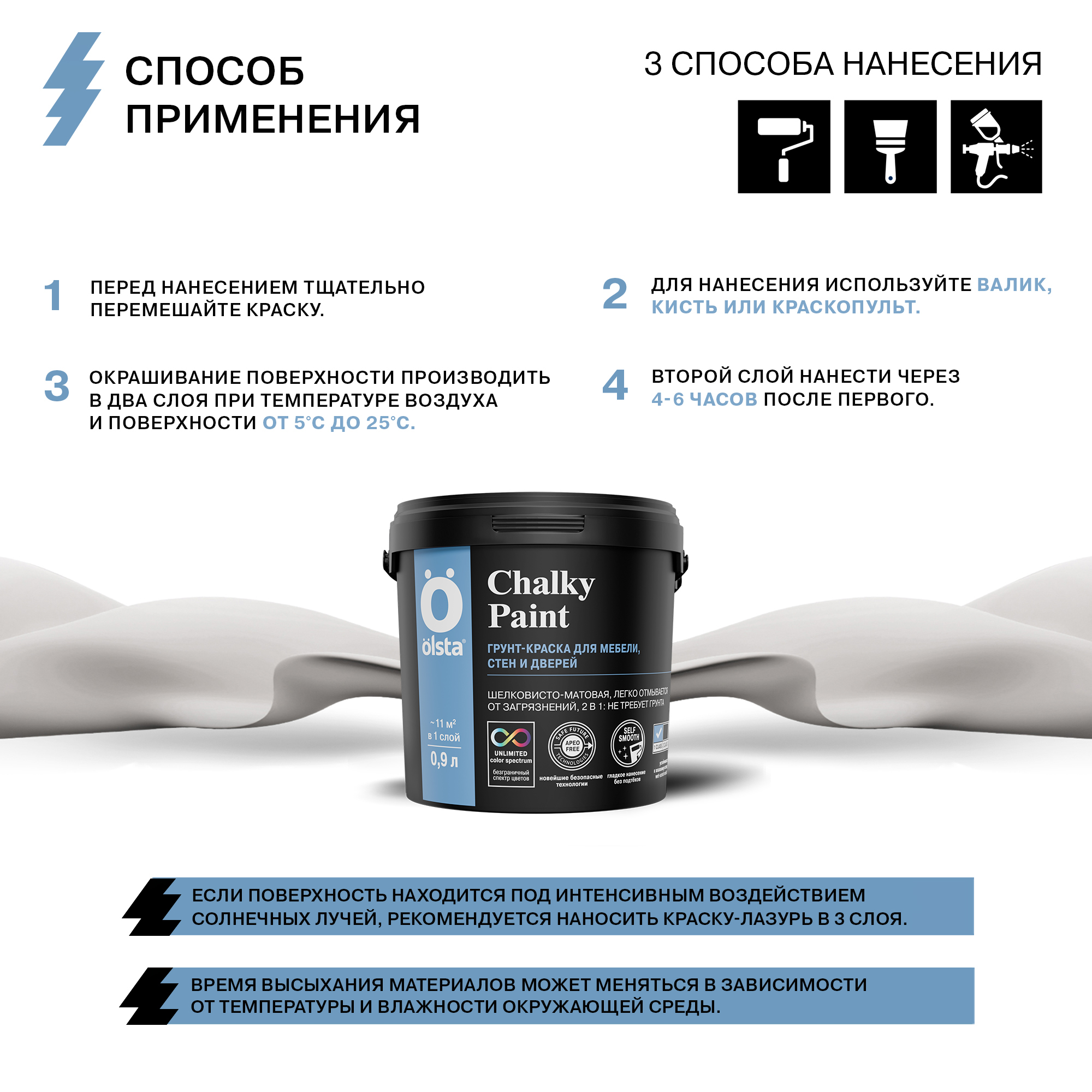 Краска для мебели меловая CHALKY PAINT - это Краска для мебели меловая OLSTA CHALKY PAINT — это непревзойденное решение для тех, кто мечтает о стильной и долговечной мебели без лишних хлопот. Эта мебельная краска обладает уникальной матовой текстурой, напоминающей натуральный мел, что придает поверхности уютный и элегантный вид. Экологичная формула на водной основе гарантирует отсутствие неприятного запаха, делая процесс окрашивания комфортным как для вас, так и для вашего дома. OLSTA CHALKY PAINT отличается своей стойкостью к износу, обеспечивая долгие годы безупречного вида вашей мебели. Благодаря возможности колерования, вы можете подобрать идеальный оттенок под любой интерьер, создавая неповторимую атмосферу в каждом уголке вашего пространства. Используйте эту краску для обновления старых вещей или придания оригинальности новым предметам мебели, наслаждаясь безопасностью и качеством продукта, который отвечает всем современным требованиям экологии и дизайна.
