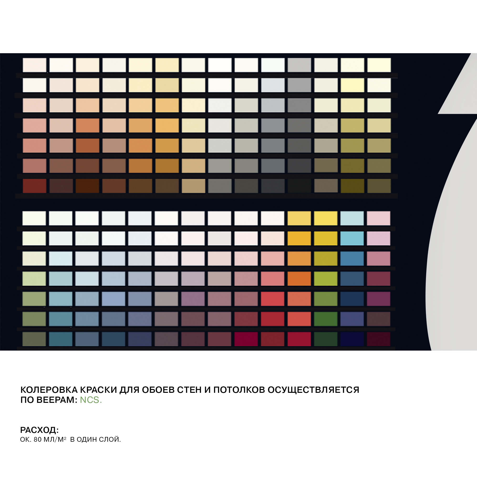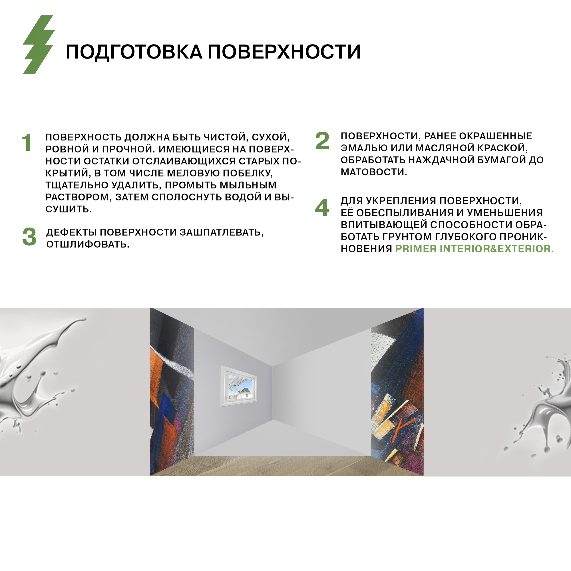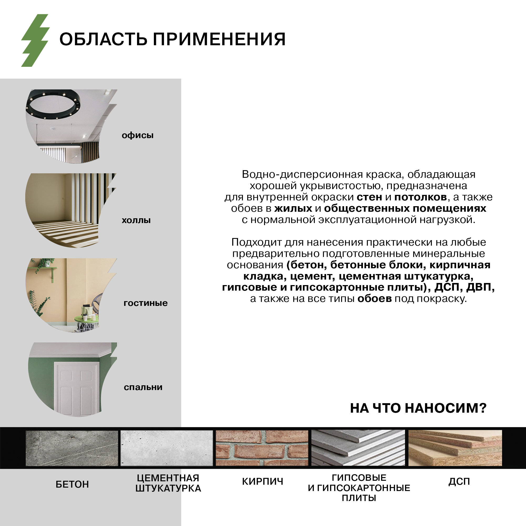 Водно-дисперсионная краска, обладающая хорошей укрывистостью, предназначена для внутренней окраски стен и потолков, а также обоев в жилых и общественных помещениях, с нормальной эксплуатационной нагрузкой. Подходит для нанесения практически на любые предварительно подготовленные минеральные основания (бетон, бетонные блоки, кирпичная кладка, цемент, цементная штукатурка, гипсовые и гипсокартонные плиты), ДСП, ДВП, а также на все типы обоев под покраску.