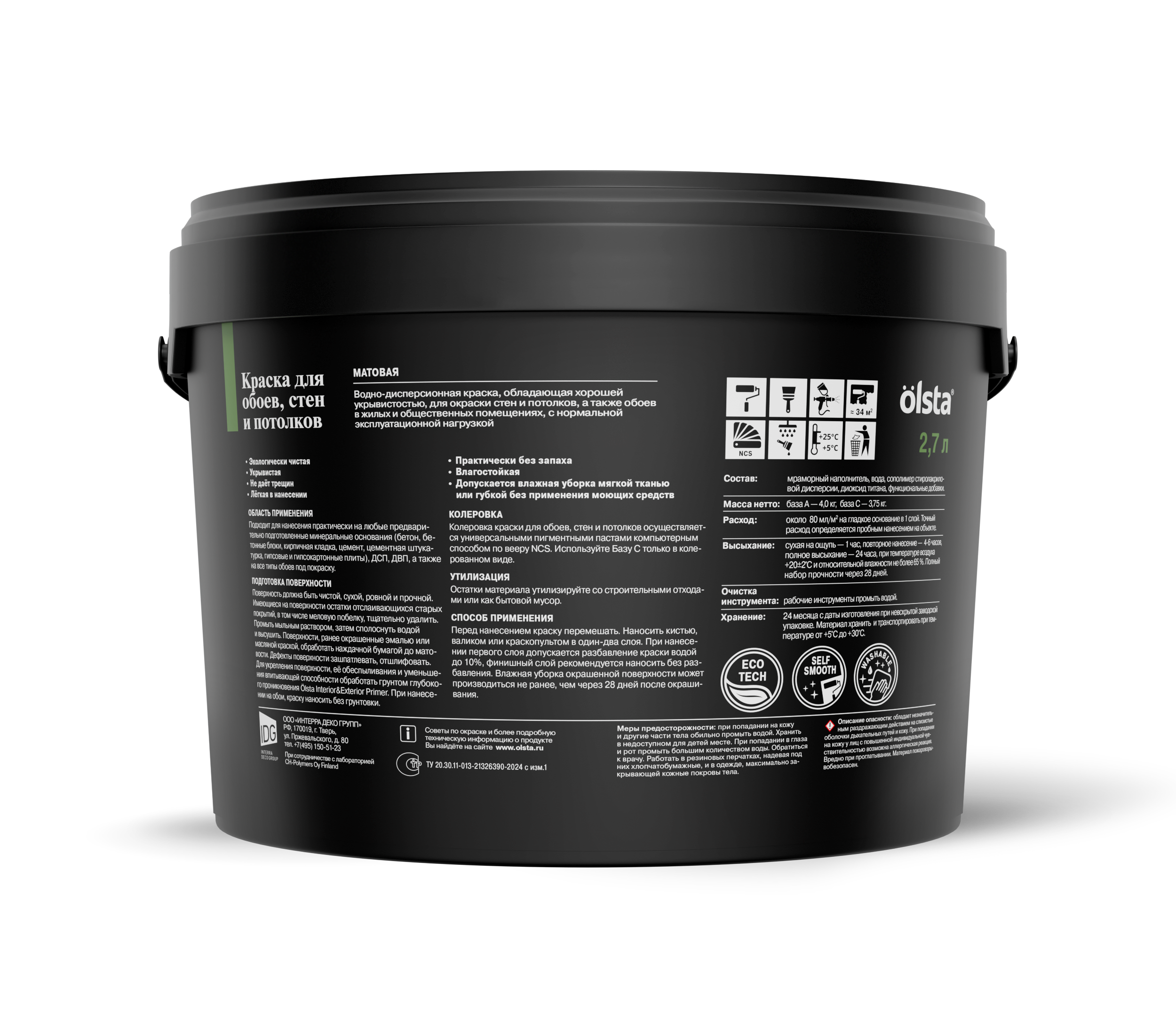 Краска для стен, обоев и потолков - это Водно-дисперсионная краска, обладающая хорошей укрывистостью, предназначена для внутренней окраски стен и потолков, а также обоев в жилых и общественных помещениях.