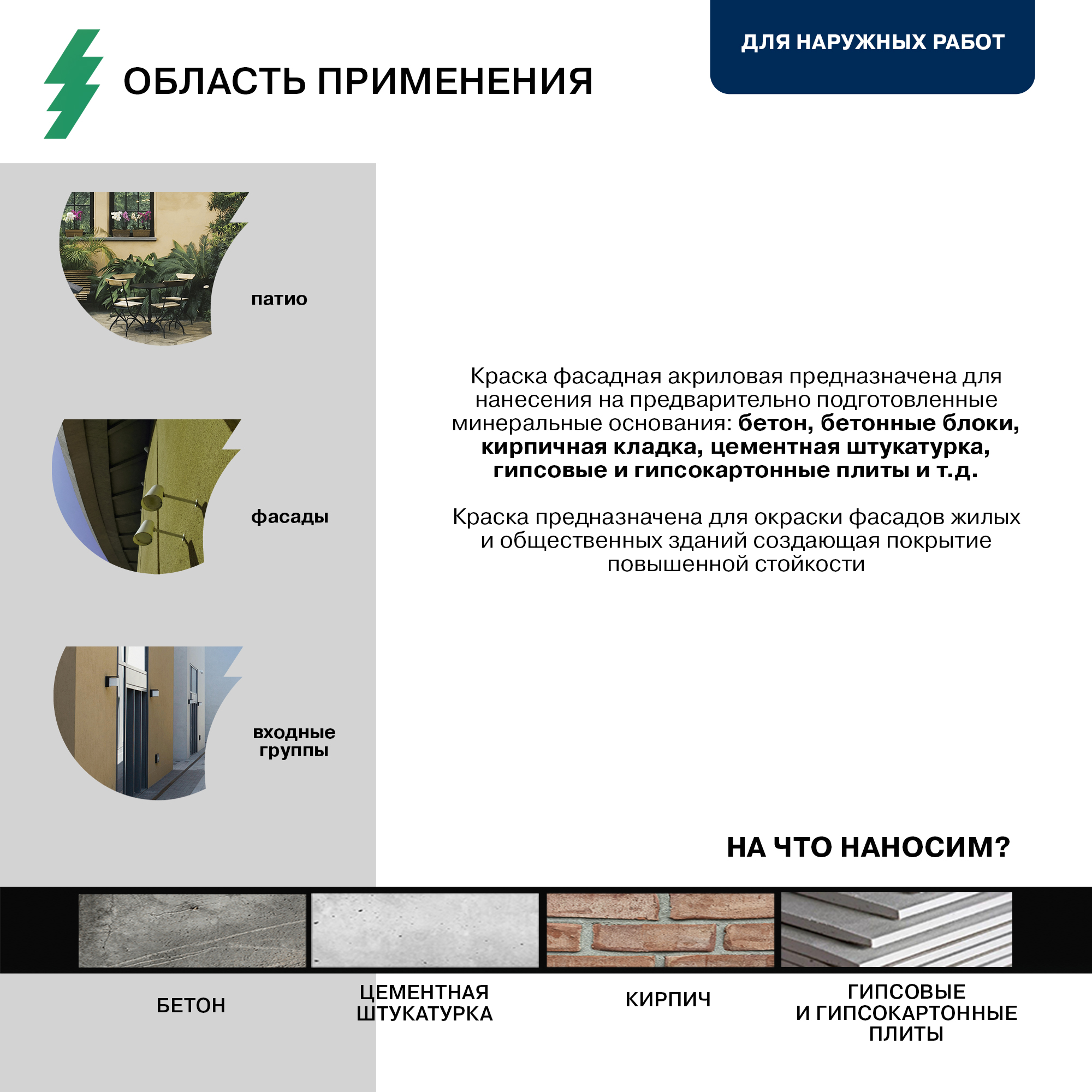 Краска фасадная акриловая предназначена для нанесения на предварительно подготовленные минеральные основания: бетон, бетонные блоки, кирпичная кладка, цемент, цементная штукатурка, гипс, гипсовые и гипсокартонные плиты и т.д.