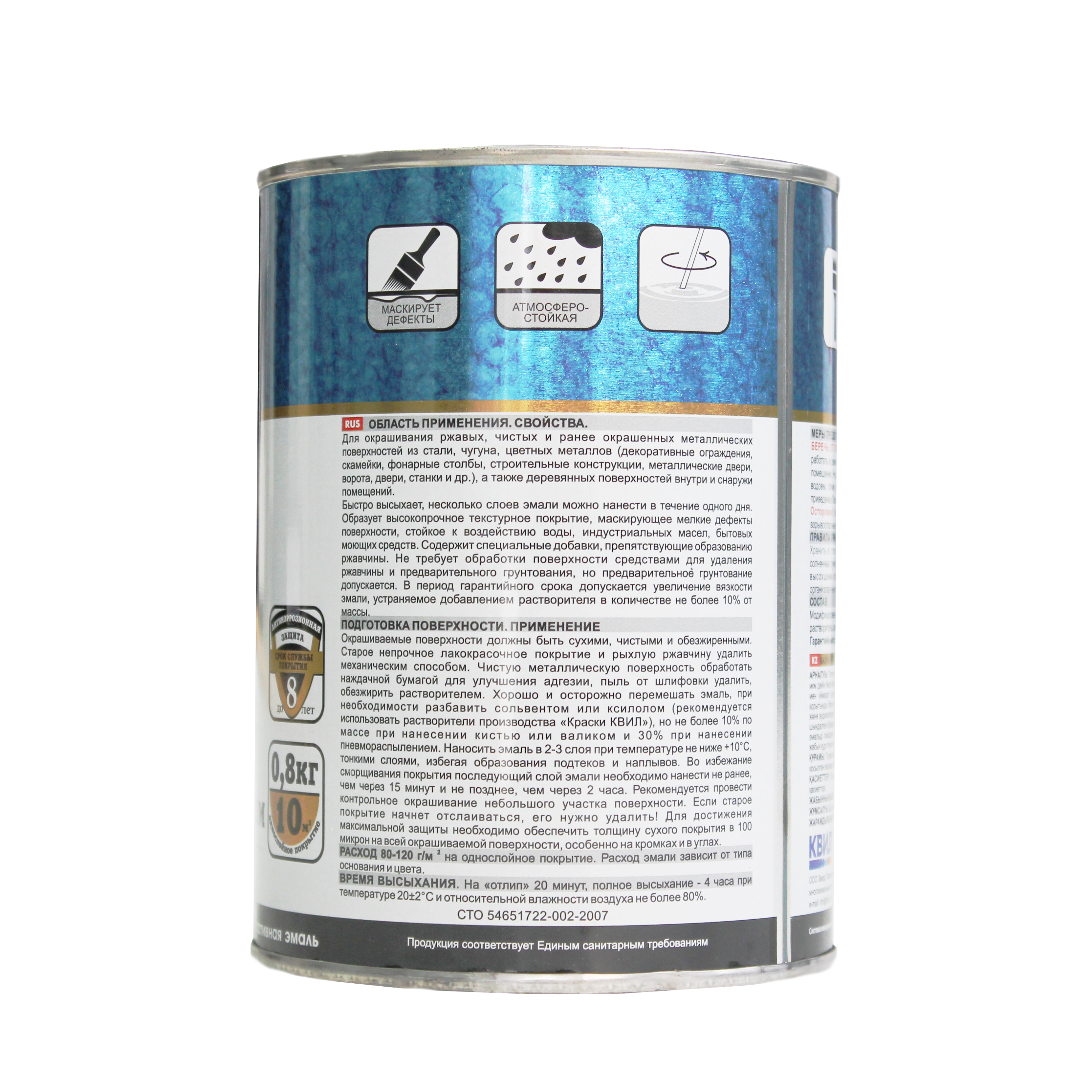 Реализуется в таре: 0,8 кг; 12,8 кг; 16 кг; 2,5 кг, подходит для внутренних и наружных работ по металлическим, образуемое покрытие: молотковое, расход (если применимо): до 0,11 л