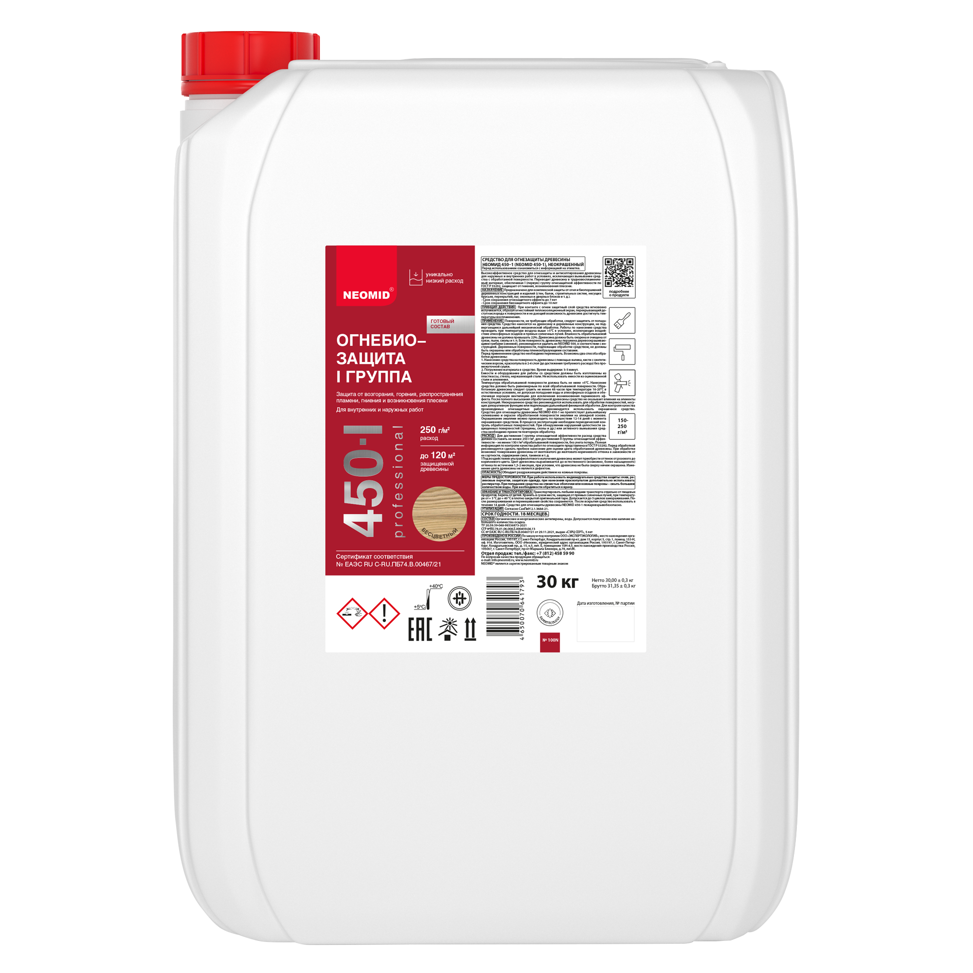 NEOMID 450 огнебиозащитный состав 1 группа - это Состав специального назначения для комплексной защиты от огня и биопоражений деревянных конструкций и изделий. Обеспечивает I группу огнезащитной эффективности по ГОСТ Р 53292-2009