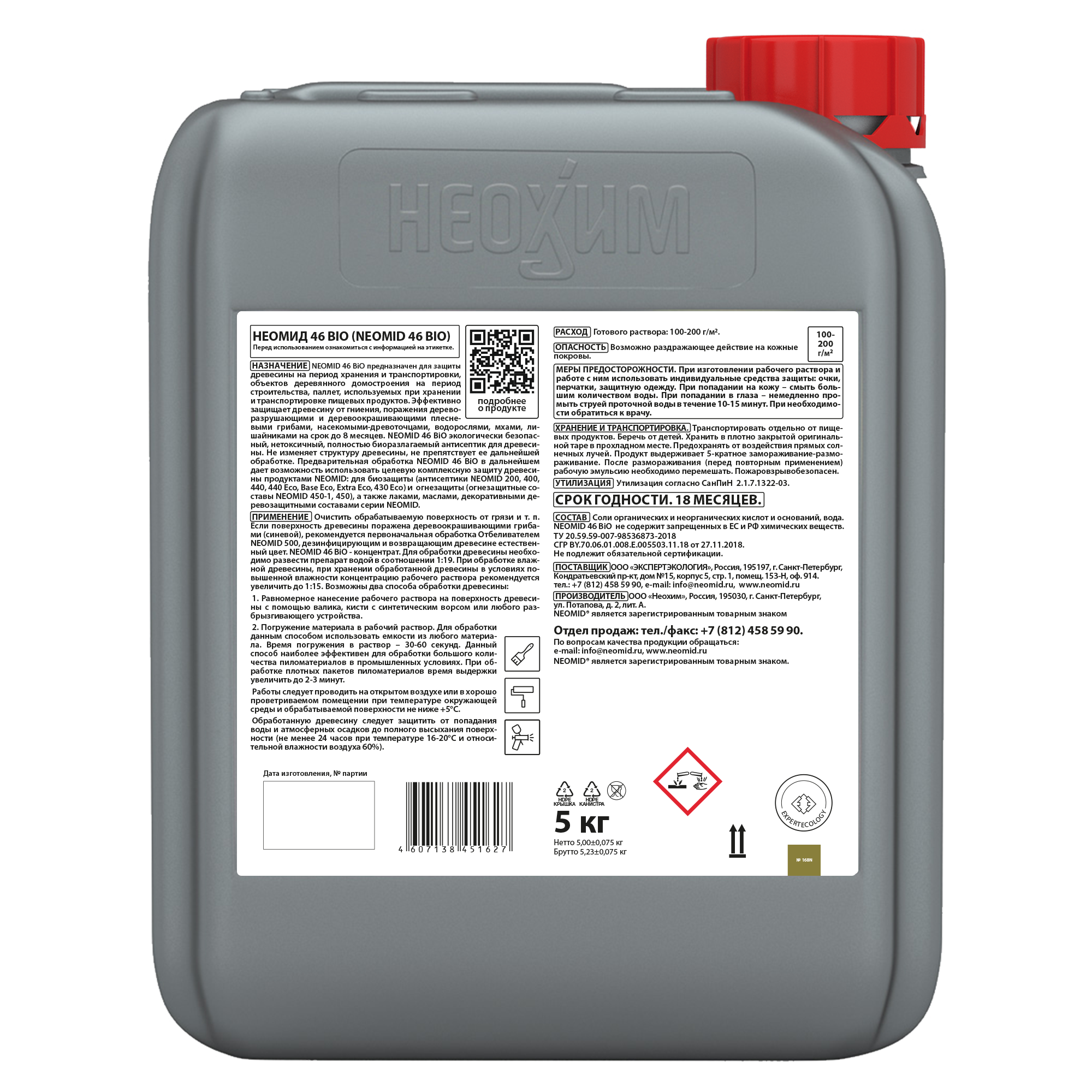 NEOMID 46 BiO – концентрат. Для обработки древесины необходимо развести препарат водой в соотношении 1:19. При обработке влажной древесины, при хранении обработанной древесины в условиях повышенной влажности концентрацию рабочего раствора рекомендуется увеличить до 1:15.